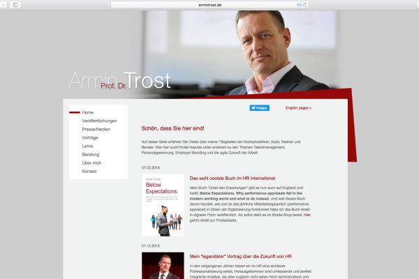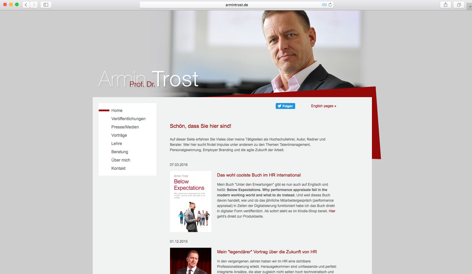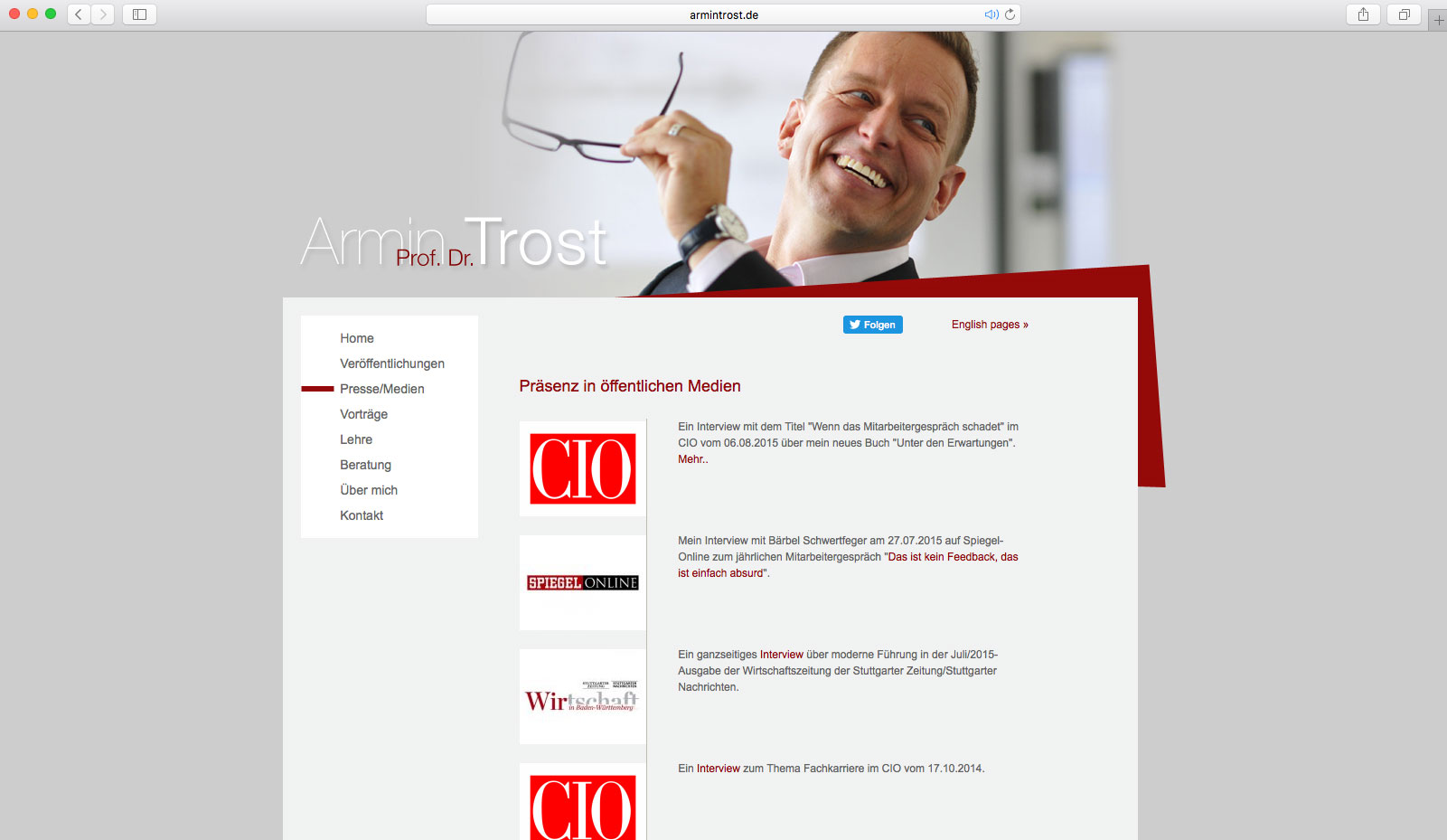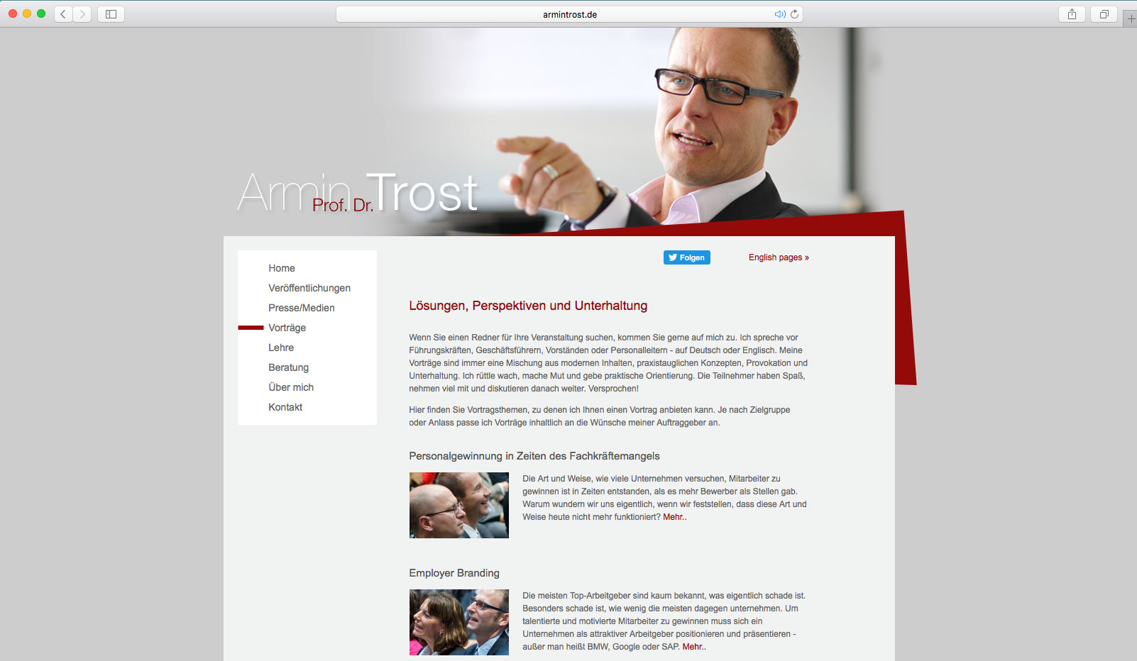 Für Prof. Dr. Armin Trost gestaltete farbdosis einen Webauftritt, der sein gesamtes Profil abbildet. Mit dem Content Management System Contao ist die Site einfach pflegbar.