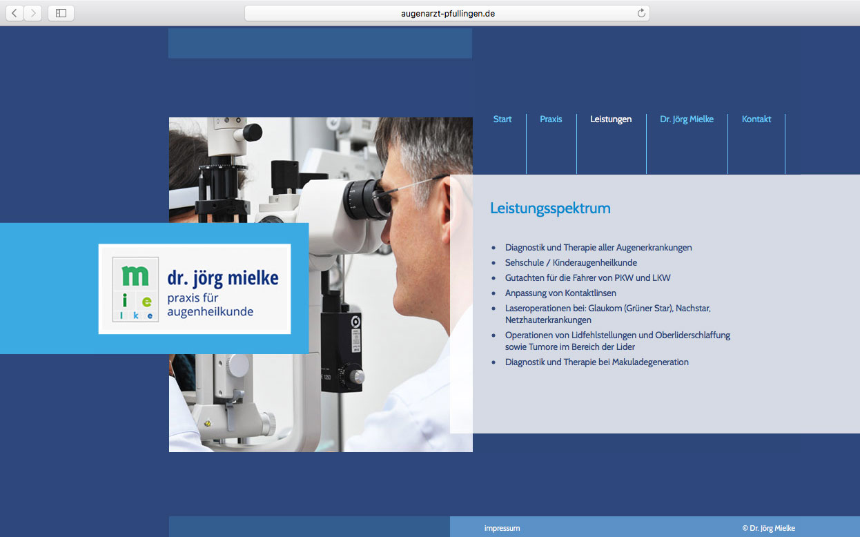 Für die Augenarztpraxis Dr. Mielke entwickelte farbdosis ein Logo, das die Arbeit des Augenarztes verbildlicht. Ausgehend von Logo und Fotografie von Klaus Ditté gestaltete farbdosis auch die Website der Praxis.