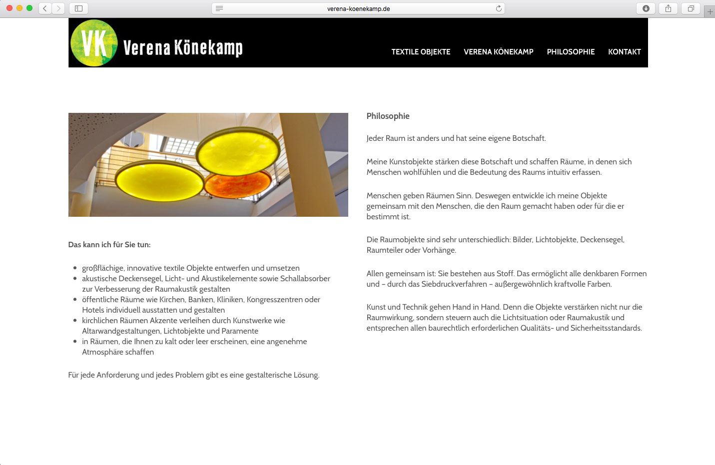 Für die Textil-Künstlerin gestaltete farbdosis einen responsiven Webauftritt, der ihr gesamtes Profil abbildet. Mit dem Content Management System Wordpress ist die Site einfach pflegbar.