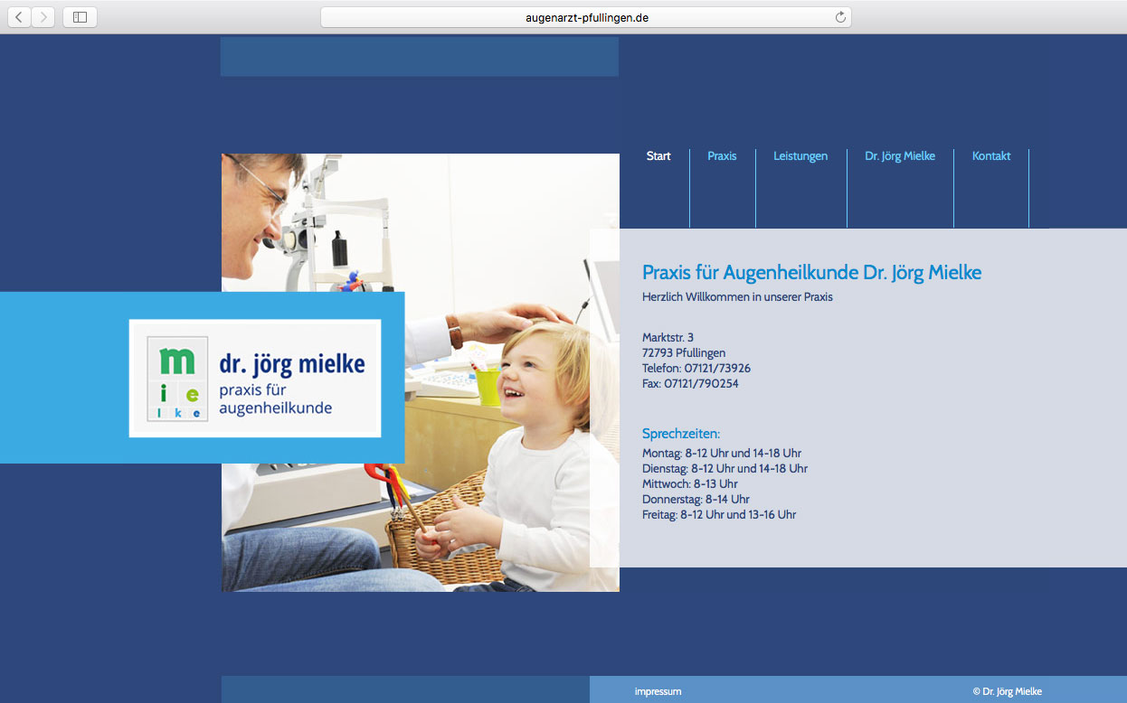 Für die Augenarztpraxis Dr. Mielke entwickelte farbdosis ein Logo, das die Arbeit des Augenarztes verbildlicht. Ausgehend von Logo und Fotografie von Klaus Ditté gestaltete farbdosis auch die Website der Praxis.